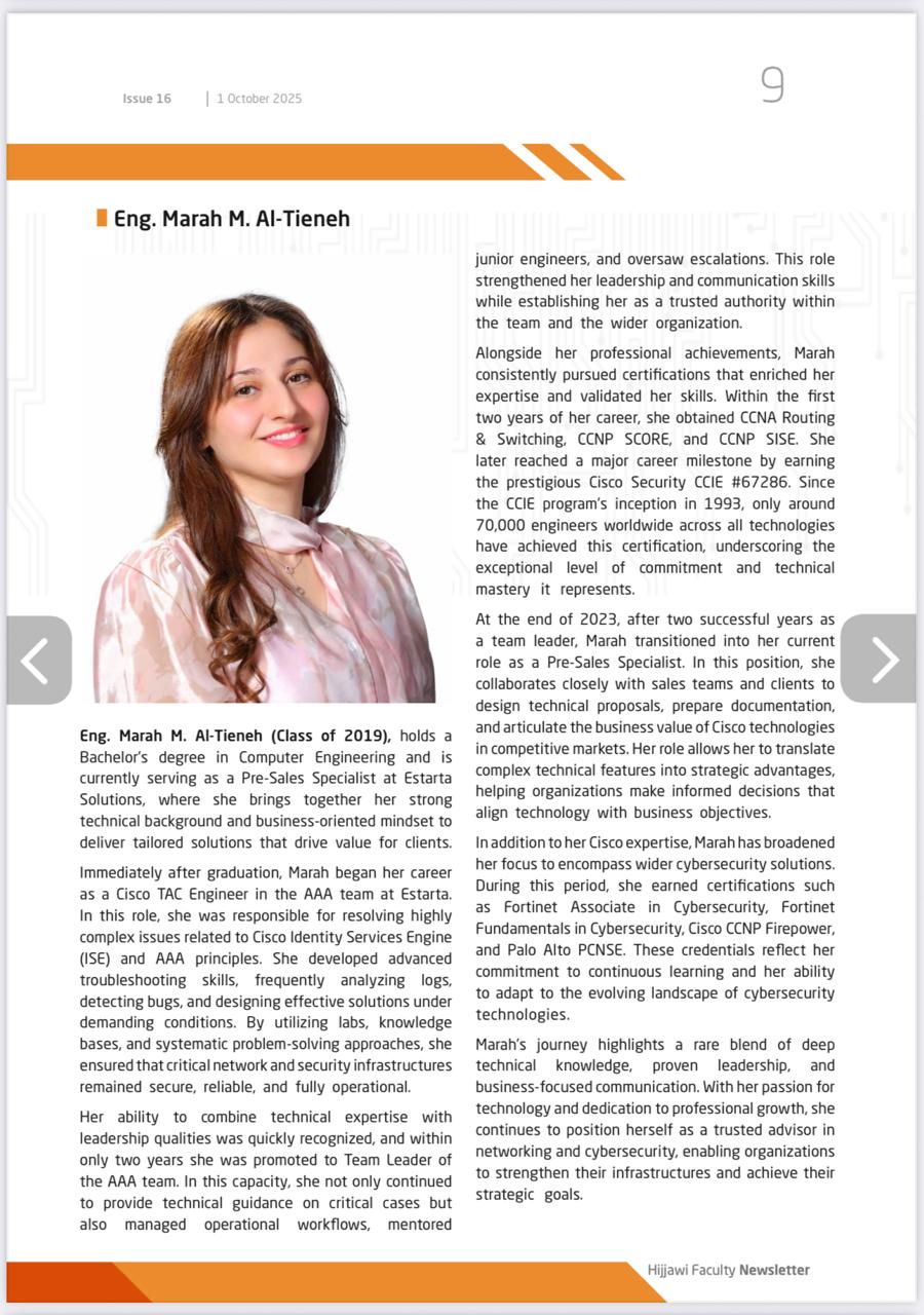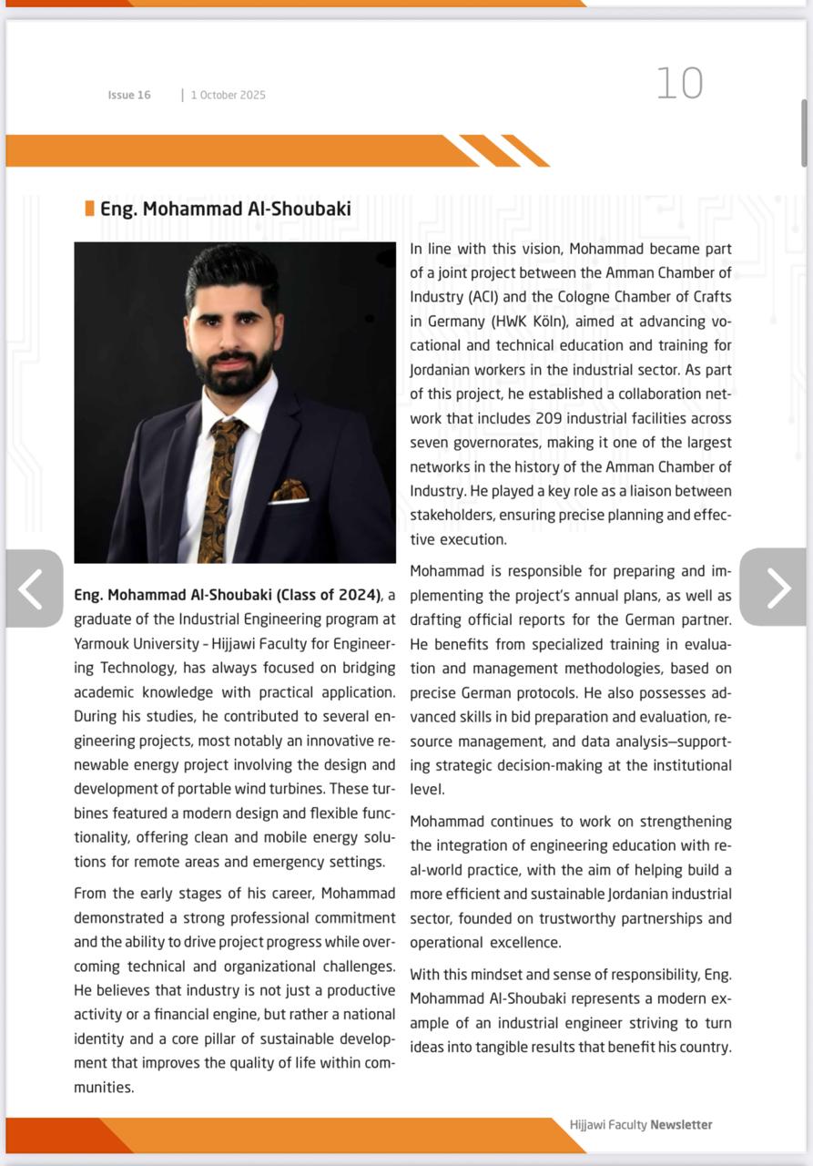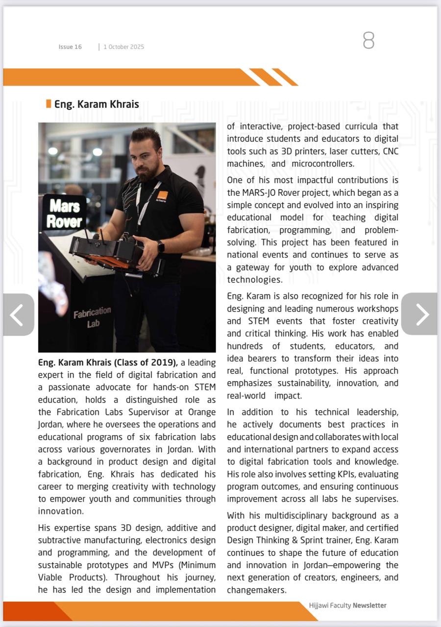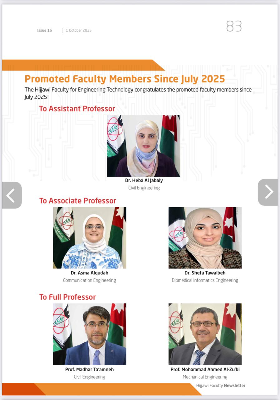 This issue coincides with the conclusion of the 2024/2025 academic year and the beginning of the 2025/2026 academic year. It features a message from the Dean, Prof. Mohammad Alzubaidi, highlighting the faculty’s key achievements over the past year. Among the most notable accomplishments are the submission of the ABET accreditation application for the Architectural Engineering program, the application for Jordanian accreditation for all undergraduate programs after successfully aligning them with the National Qualifications Framework, and the pursuit of ISO accreditation for the faculty. The Dean also reviewed several initiatives, including the launch of the Career Development Unit, the organization of the first Annual Alumni and Career Forum, and the securing of external funding for developmental projects and new academic programs.